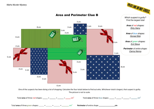 Area and Perimeter Xmas Presents worksheet | Teaching Resources This is a free-standing resource on finding the area and perimeter of rectangles. The difficulty comes as sometimes you need to use a bit of logic by looking at the diagram to find the dimensions of the rectangles. It's taken from a Murder Mystery Package I wrote hence it includes a small riddle element at the end.
